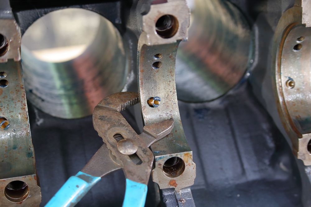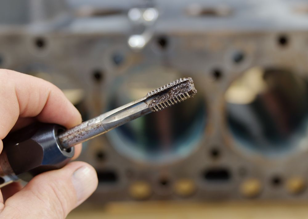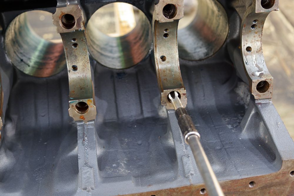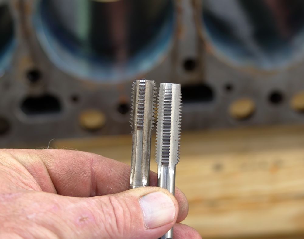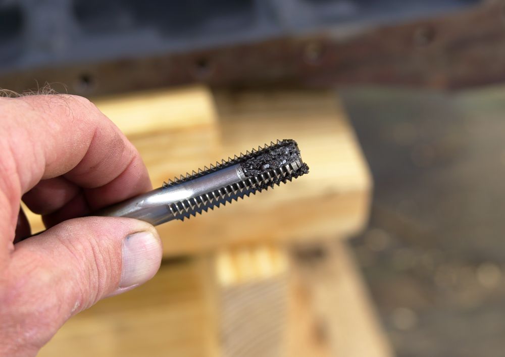 Then flipped the block over and bottom-tapped the 14mm crankshaft mains . . . .